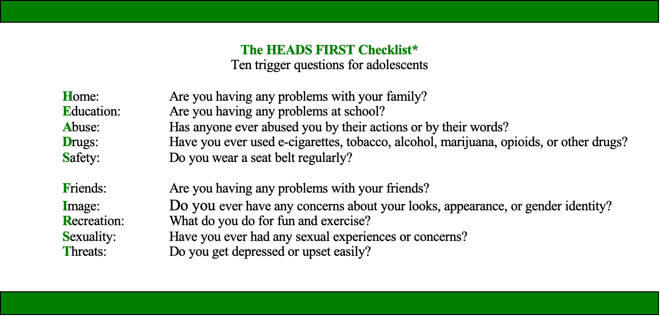 Several interview instruments exist to elicit a psychosocial history from adolescents.9-11 The HEADS FIRST Checklist is structured to offer pediatric practitioners a more streamlined, up-to-date approach to this important topic. It is especially notable that our checklist can be further differentiated from other methods by featuring specific questions about abuse, body image, and gender identity. For more than 30 years, the HEADS FIRST Checklist has been used as a clinical and undergraduate and graduate medical teaching tool at our institution to address sensitive topics that comprise the major causes of morbidity and mortality in adolescents and young adults. The checklist has been modified and updated numerous times since it was initially published in Pediatrics in Review in 1994.12 This method highlights the importance of getting into adolescents’ heads first, connecting with them meaningfully and genuinely, and reducing risk-taking behaviors. We also use the word “first” as part of the acronym to heighten awareness that psychosocial history should be considered the most important component of the routine adolescent checkup and even more important than the physical examination itself.