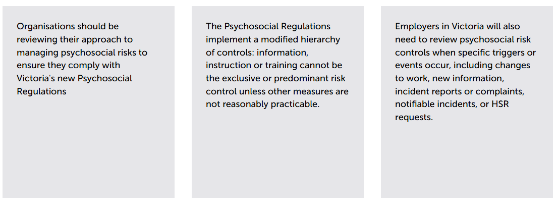 - Review your organisation’s approach and systems for managing psychosocial risks in the workplace, in light of the WorkSafe Victoria’s new Compliance Code and the Psychosocial Regulations;